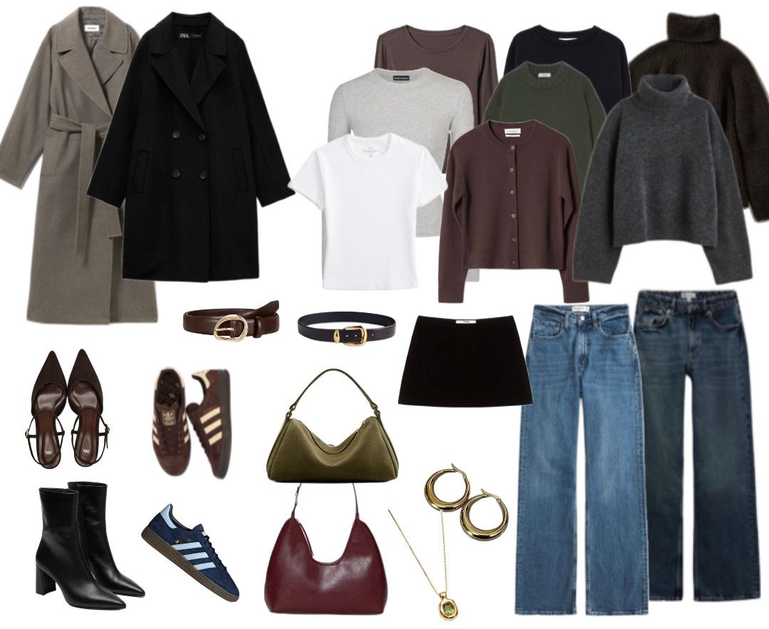 light and dark wash of denim jeans, black/dark brown mini skirt, white tee, neutral color long sleeves, oversized jumper, cardigan, neutral jacket, heavy weigth neutral long coat, purse with pop of color (deep red, olive green), simple gold jewelry, belts in both black and brown, casual sneaker, deep red or brown heels, black boots